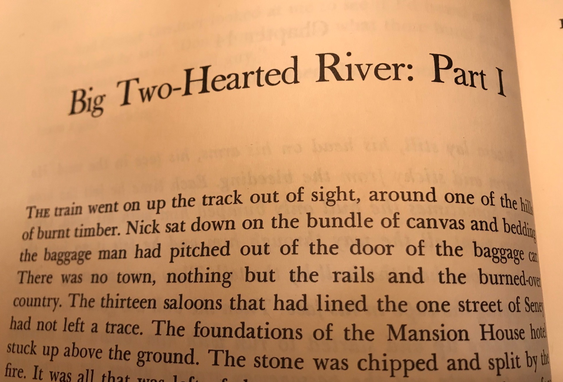 Hemingway, while still in his teens, had volunteered for the Red Cross in World War I. In July of 1918, while serving along the warring lines at the border of Italy and Austria, he was wounded by an Austrian mortar blast. He spent six months in a hospital in Milan. The war ended later that year, and Hemingway came home. In the late summer of 1919, he and high school friends went on a week-long camping-and-fishing trip in Michigan’s Upper Peninsula. While Two-Hearted River flows through the wilderness there to Lake Superior, Hemingway and his friends are believed to have fished another river, more of a classic trout stream, near the town of Seney. The latter might have been better for catching trout, but it did not have as poetic a name, thus, “Big Two-Hearted River: Part I & II.” In the story, Nick Adams returns from war and the first thing he wants to do is get back to the woods and the cold water where trout live. It’s a way to heal and cleanse the mind and soul, though Hemingway never says that so explicitly. That’s part of the genius of the story. Throughout the piece, you sense Nick’s need and desire to feel the tug of the living again.
