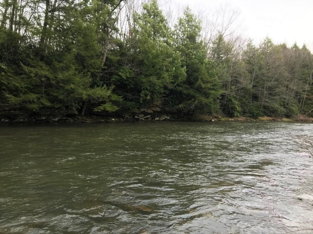 But as we hiked and fished, tossing streamer flies into fishy-looking water, I realized we had made a commitment. About an hour into the trek, I looked up and noticed that behind me, on the west/northwest side of the river, was a high, steep ridge. If I should decide to go back to the parking lot, no way was I going to slip out easily to the farm road. The only way out was the way we had come in. But doing that seemed like a lame idea.