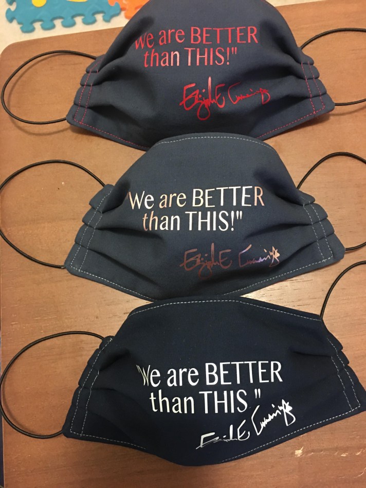 First, about the face masks: A niece of the late Baltimore congressman, Elijah Cummings, has been making fashionable face masks for three months, and decided recently to pay tribute to her uncle with his most-quoted line: “We are better than this!” Deborah Cummings-Thomas said she got the idea while reading my May 31 Sun column. “When I read your column it occurred to me that while we may not be able to have Elijah’s voice, we do have his words as a reminder that “we are better than this.” She sells them for $14 each and will give a portion to a community group she says she hasn’t selected yet. Deborah goes by Baltimore’s Mask Lady on Facebook, and that’s where you can find ordering information.