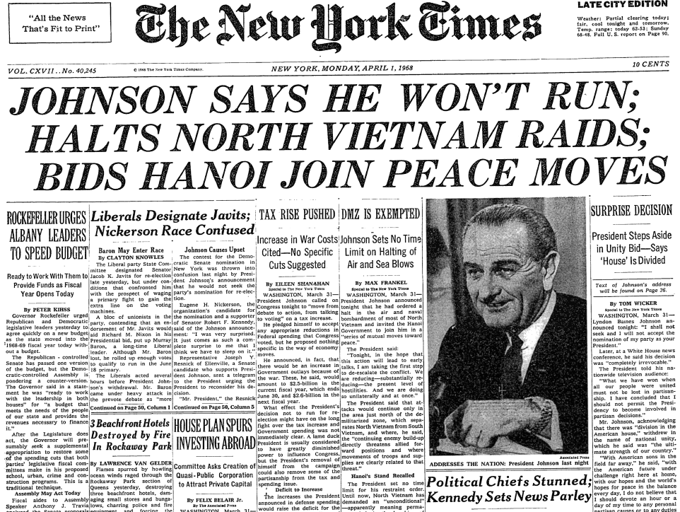 Swamped by opposition to the Vietnam War, Johnson opted out of running for re-election in 1968.
