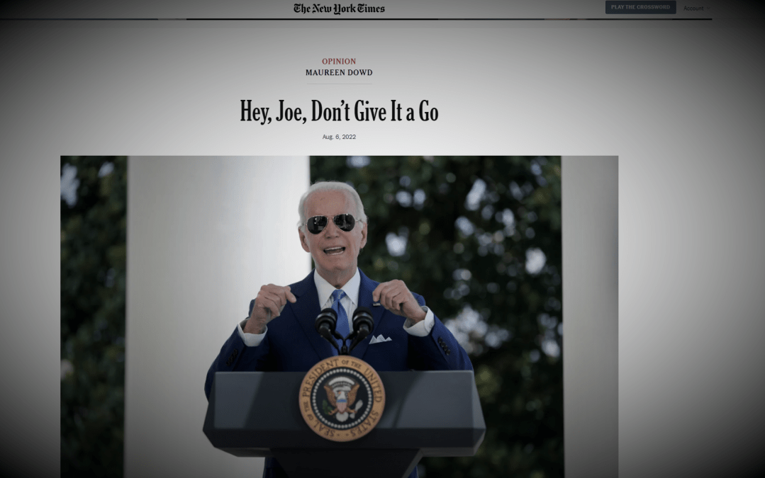 But Dowd’s column and the discussion about Biden’s age and executive capacity come at a pretty strange time: Just when Congress is about to approve his Build Back Better legislative package reduced and reconstituted as the Inflation Reduction Act. It contains historic funding to address and slow global warming, bring down the costs of prescription medications and tax the huge corporations that have paid, thanks to Republicans, virtually nothing for years.