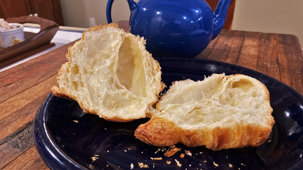This one from Croustille Cafe French Bakery in Pikesville might be called “the humpback” because the master baker at this kosher shop obviously takes seriously the charge to keep the croissant light and airy, creating an unusually high peak at its center, and with a crusty (croustillant) finish. It’s also one of the largest croissants I’ve ever seen. As you might note from the photo, it opens nicely, exposing the airy pockets inside. The Croustille Croissant was also delicious with morning coffee. Bravo! Il est bien fait!