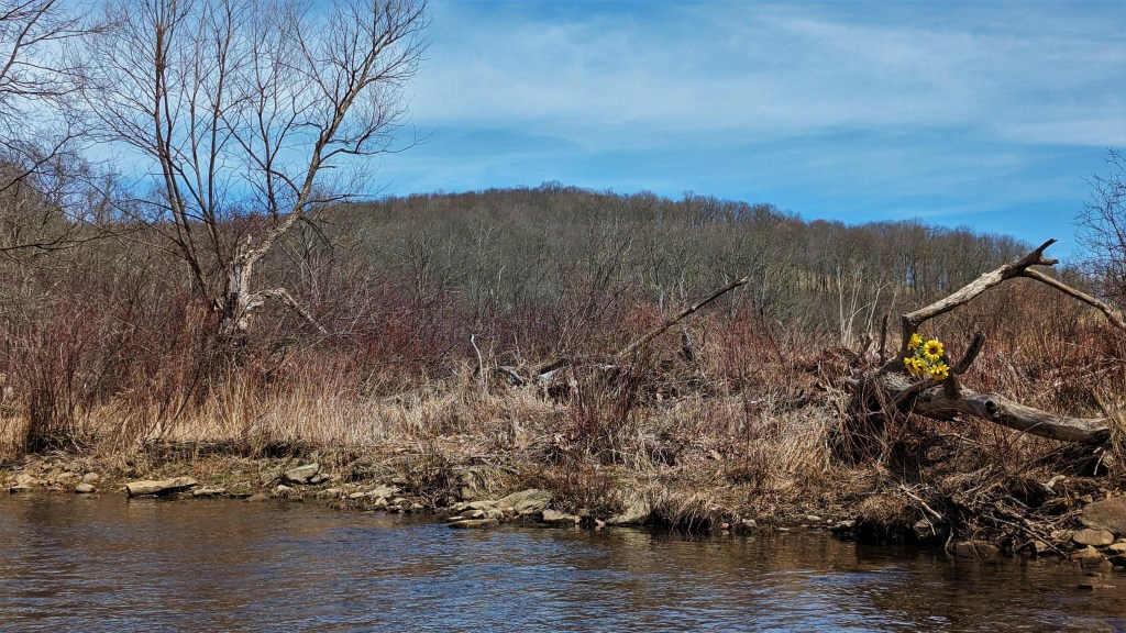 Someone hiked through mud and over large piles of flood debris to get to a spot on the river to plant a modest memorial to someone they cared about. It was impossible to miss against the gray-brown tableau of the recently concluded winter. Someone inserted the metal stems of fake sunflowers into one of thousands of logs that had been stacked against the east river bank in a storm. And there was a small wooden heart with Hallmark words of remembrance. I’ve seen many memorials — mostly on lampposts or sign posts in Baltimore neighborhoods and along suburban roads and highways — but never one by a river. I thought for a fleeting moment that someone might have drowned near this spot, but it seemed unlikely, given the size of the river, and, anyway, I’d rather not think about that. I’d rather think it was someone who was loved, someone who loved this place, someone who might have fished for trout along this river or just enjoyed the view to the west — all meadows and mountains and wild flowers in spring.