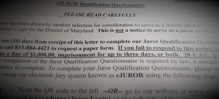 I received a notice the other day from the U.S. District Court in Maryland that I might be called for federal jury duty. It was not a summons, merely a request that I fill out a juror questionnaire. If I do not do as requested, the letter said, “you may be subject to a fine of $1,000, imprisonment for up to three days, or both.” I am inclined, in good citizenship, to comply, but the penalty for not responding adds an extra nudge. Likewise, the possibility of prison or fine, or both, for lying on the eJUROR form is there to keep people from making up phony excuses to get out of federal jury duty.