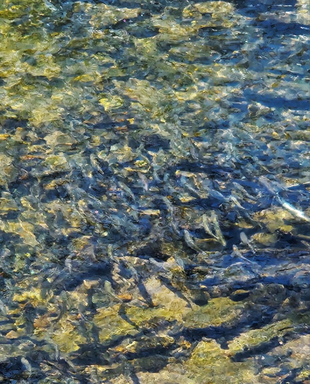 The image with this post might seem a little surreal or abstract; it’s certainly not an example of high-definition nature photography. But it gives a sense of what you see in April, when herring first arrive in a freshwater creek. You detect movement of some kind, but you’re not sure. Your eye has to adjust to seeing the river bottom for the first time in months. Without polarized glasses, it’s difficult to discern what’s happening. But, if you stand still and focus on a spot in the river, soon you see them – and soon a whole school of them might appear.