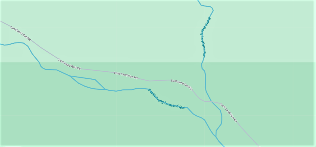 Some clever person some years ago named two small brooks that lead to a run, calling them the North Prong and South Prong. The two prongs form a fork — as do the prongs of big forks that come with carving knives — and at the fork the prongs become Lostland Run, and Lostland flows to the North Branch of the Potomac River, and the North Branch meets the South Branch and that leads to the mainstem Potomac, and on and on, to the Chesapeake Bay and the big blue world beyond. I don’t know who came up with prong for the sources of a fork, but thanks for the smile.