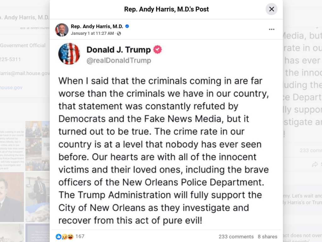 Bad enough that Fox “News” and Trump spread the lie that the attacker in the New Orleans horror had driven to Bourbon Street from Mexico, suggesting that the crime was the result of Biden border policy. It was a lie, of course. The killer of 14 was an American citizen and Army veteran. He crossed no border, according to the FBI. But, as we all know by now, the truth never matters to Trump and his Republican supporters in the right-wing nuthouse, Rep. Andy Harris of Maryland among them. Here’s Harris’s Facebook reposting of Trump’s lies about the attack and about the nation’s crime rate. (The FBI’s most recent report shows that violent crime fell by an estimated 3% between 2022 and 2023. Murder and non-negligent manslaughter dropped by 12%, the largest in the last 20 years.)