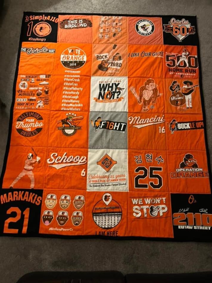 My son and daughter had piles of T-shirts and sport jerseys from ice hockey and lacrosse and from school plays. They were no longer being worn and taking up three full bins. I got their permission to quilt their T-shirts and jerseys — the ones they did not care to keep whole — then contacted Peggy Buzzard, a specialist in memory quilts who sews in her rowhouse in Colgate, on the east side of Baltimore County. (She made all the quilts in photographs with this post.) The results were quite pleasing. I don’t know if my son and daughter will actually use the quilts, but they now have patches of memories stitched together to form a colorful picture of their days in school and sports.