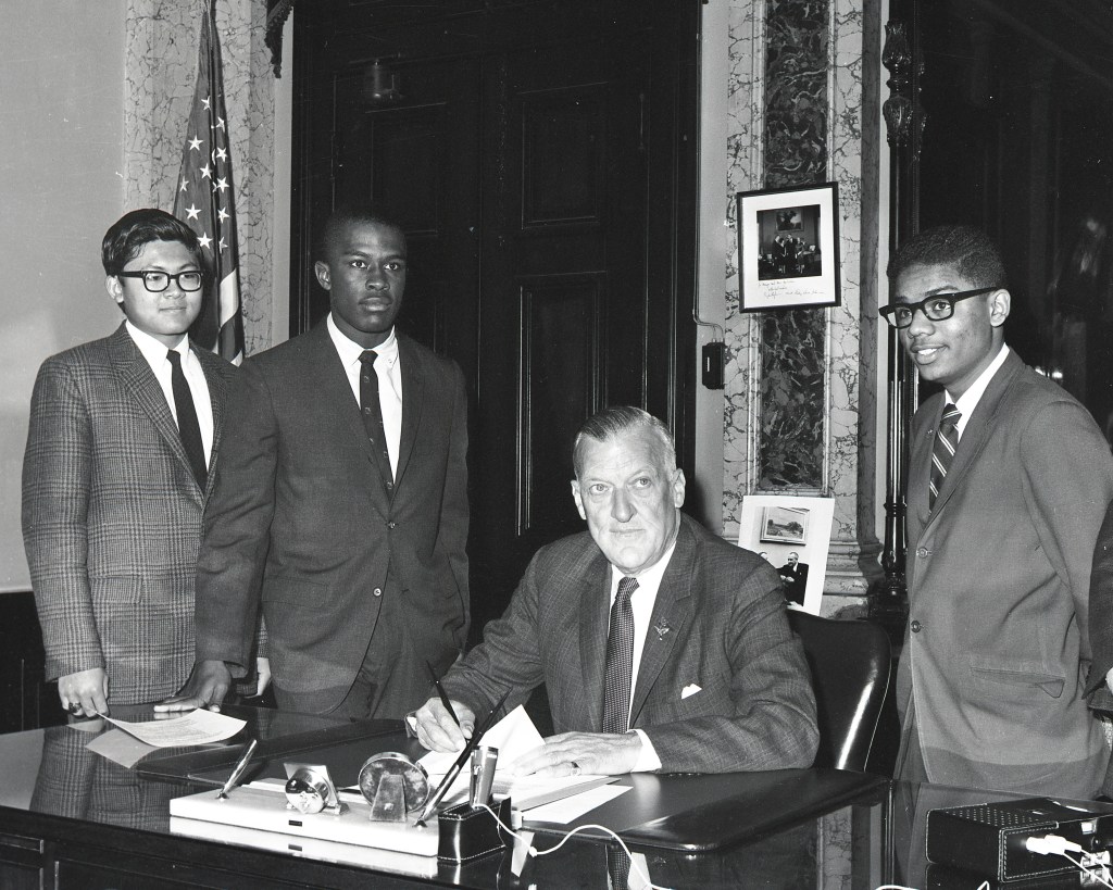 Mr. Milner, a City College graduate, took this photo for the high school yearbook. “It was Thanksgiving 1966,” he says, “when City played Poly on Turkey Day at Memorial Stadium.” City-Poly was a huge football rivalry for decades, and Mayor McKeldin had students from each team sign some sort of “peace agreement.” At the time of the photo, the young Mr. Schmoke, second from left, would have been a senior at City, the student government president and the football team’s star quarterback. He led City to two undefeated seasons and successive Maryland Scholastic Association A-conference championships in 1965 and 1966. He graduated in 1967 and went to Yale. Mr. Schmoke was elected Baltimore State’s Attorney in 1983, then Mayor of Baltimore in 1987; he served three terms, until 1999. Mr. Milner identified the young man to Mr. Schmoke’s right as Jimmy Wu. The two other students with Mayor McKeldin were from Poly. (If you can identify them, please drop me a line.) Mayor McKeldin was in his last term as Mayor. He had served as the city’s chief executive 20 years earlier, from 1943 until 1947. He ran for Governor of Maryland in 1950 and won. He served two terms in Annapolis before returning to his native Baltimore to practice law, then run for Mayor again in 1963. He opted not to seek re-election in 1967. He was the city’s last Republican mayor.