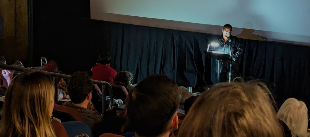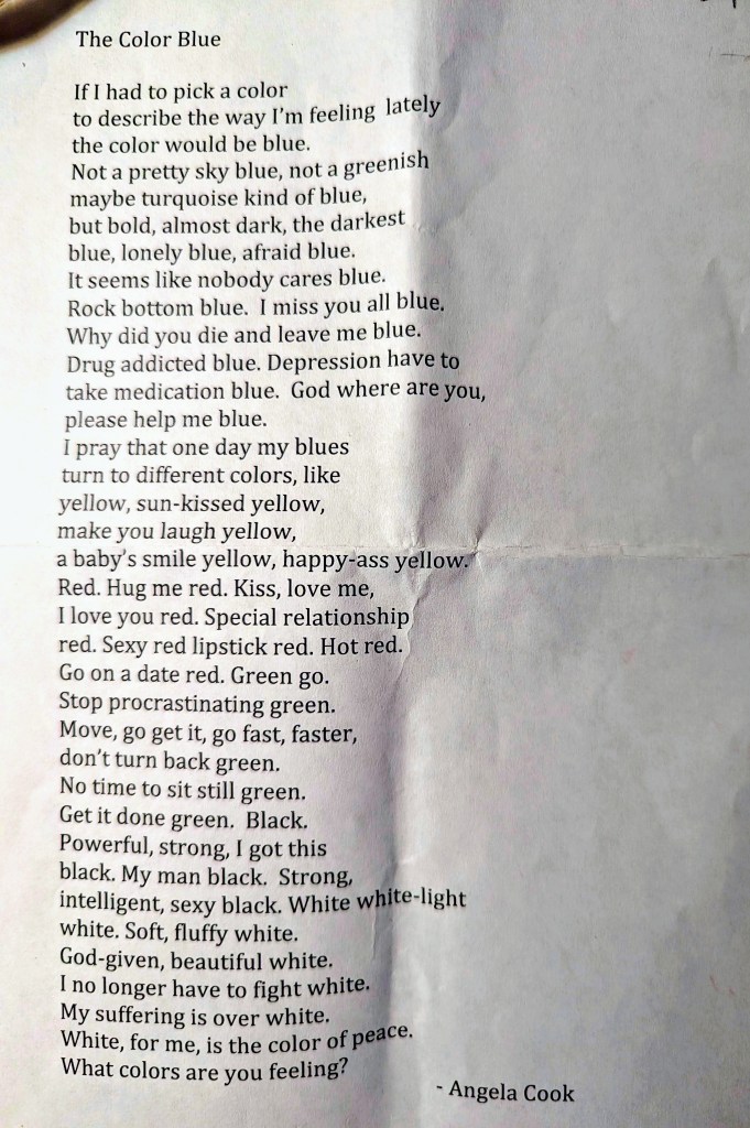 There were many good, interesting and moving poems presented at Baltimore’s historic Senator Theatre the other night — poetry and prose from members of one of the Glenwood Life Counseling Center recovery groups — but the one I offer in this space, as a tonic for our troubled times, is “The Color Blue” by Angela Cook (in photo). . . . Before we get there, a brief announcement: Lia Purpura leads the weekly poetry group at Glenwood. “Resilience In Verse: Poetry Night on York Road” was supported by the York Road Improvement District, the Maryland State Arts Council and the Senator Theatre. Thanks to everyone for a truly uplifting evening, starting with Angela Cook:
