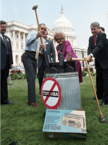 She stepped out of her Capitol Hill office one day in 1987 to join other members of Congress in smashing a Japanese-manufactured radio with a sledge hammer. Bentley was fighting a losing battle. Japanese technology and automotive engineering were advancing rapidly and surpassing the U.S. in the 1980s. Two gasoline crises, in 1973 and 1979, had increased demand for smaller, fuel-efficient cars, and Detroit had done little in response. Japanese companies also produced excellent electronics for the consumer market. No one was going to stop technological advances and the expanding international market with a sledge hammer.