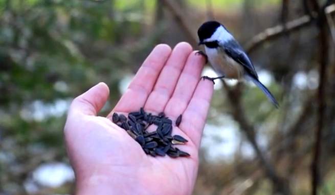 On a whim of the moment, I put some black-oil sunflower seeds in my right hand and held them out with the hope that a black-capped chickadee might take them.
