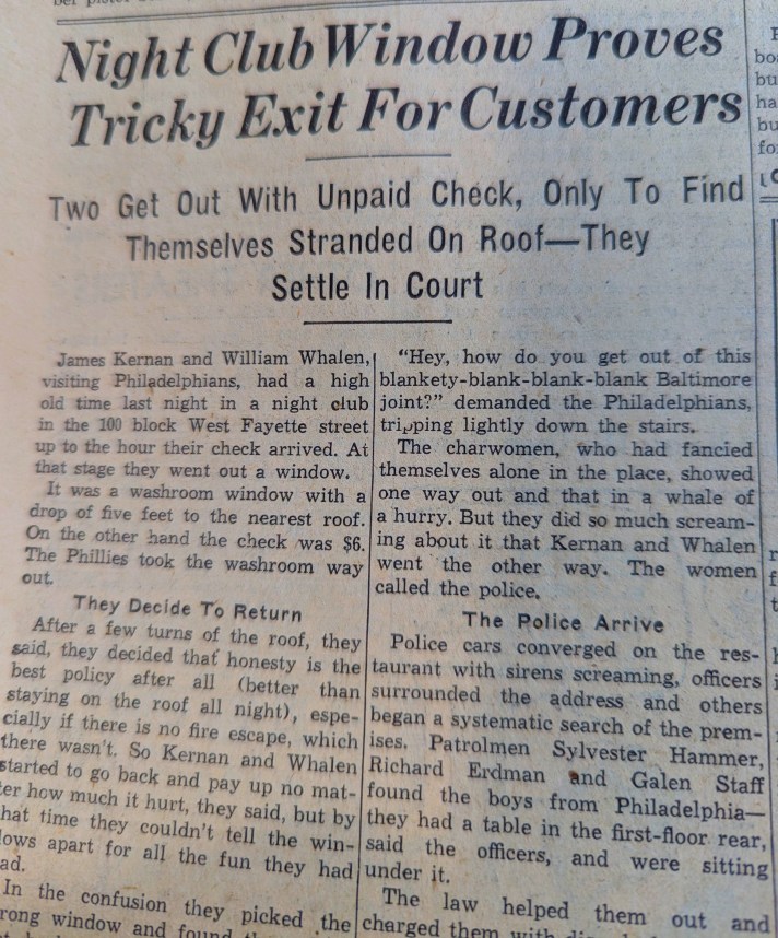 An amusing story (right) about two guys from Philadelphia who decided to skip out on their $6 bill at a nightclub on Fayette Street, only to find themselves on a roof of a building and unable to make their escape. They decided to go back inside and pay up, but went through the wrong window and ended up trapped inside an adjoining restaurant.