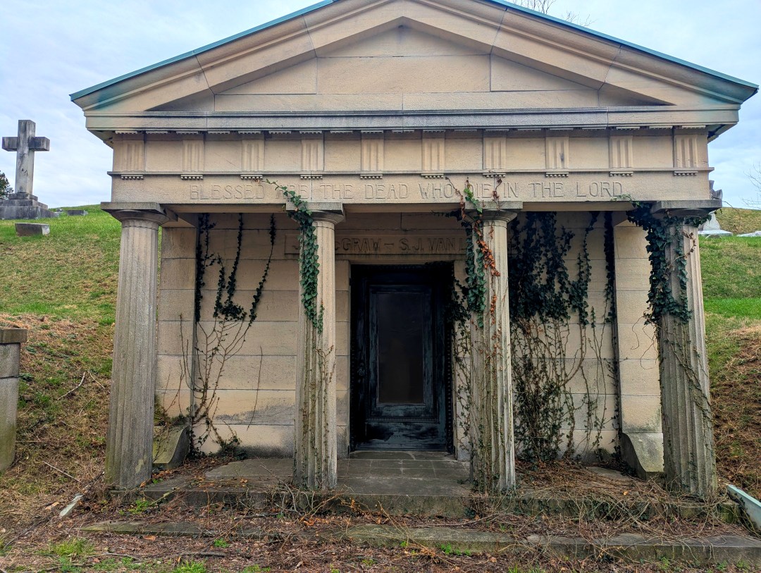 New Cathedral Cemetery, a sprawling, hilly burial ground on the southwestern side of Baltimore, has the distinction of being the final resting place of four Hall of Fame baseball players. This photo, taken in early spring, is of the mausoleum containing the remains of John McGraw, who played for the old Baltimore Orioles in the late 19th Century — he led the National League in runs twice and originated the the Baltimore chop — and he managed the New York Giants for more than 30 years in the early 20th Century. His Giants won 10 National League pennants and three World Series championships. I have not been back to see if the McGraw mausoleum has been cleaned up. (A photograph of the structure from the past shows that it was well-kept and decorated with wreathes.) It also strikes me that a placque of some kind, describing the mausoleum’s distinguished guest, would be appropriate. As we used to tell our editors: More to come . . .