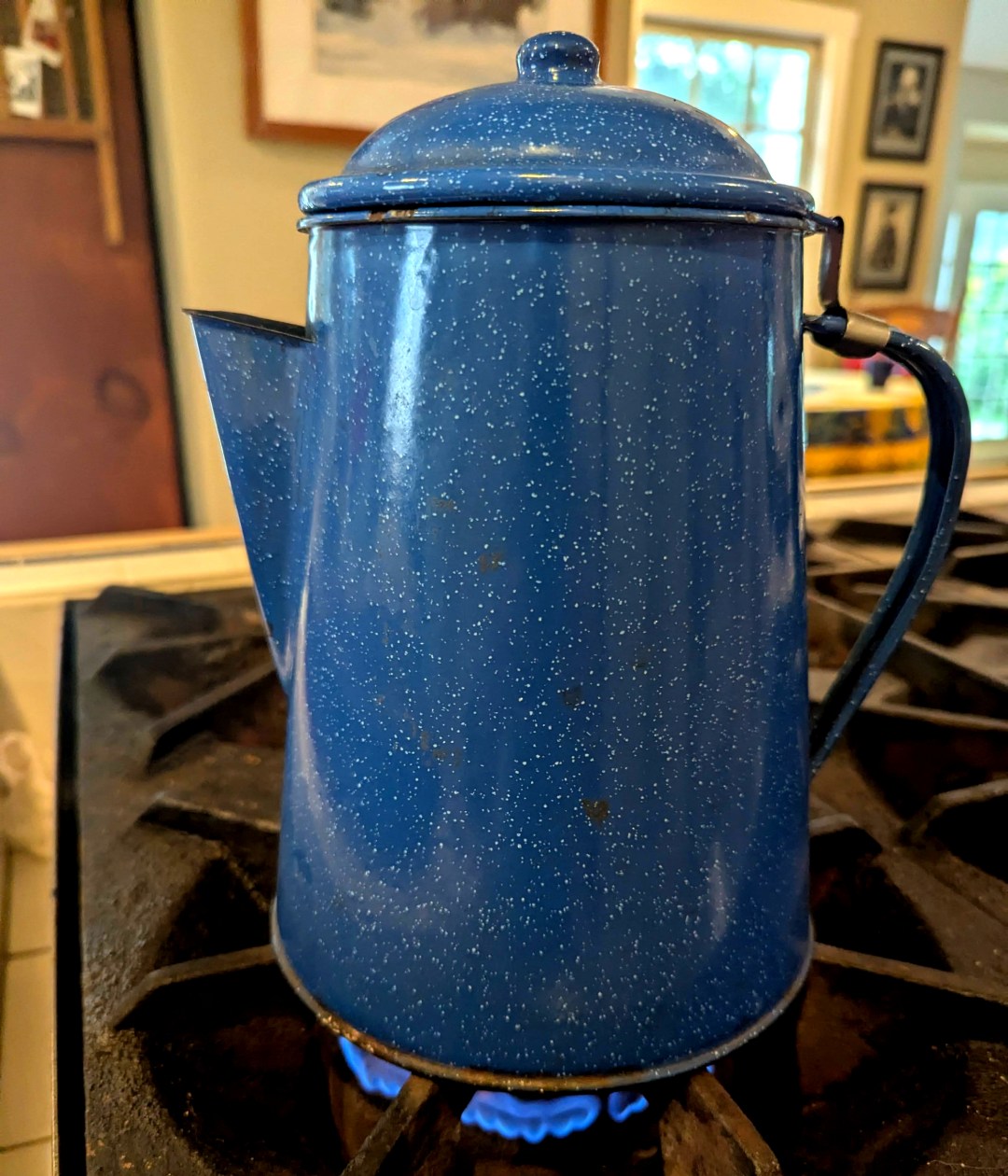 I decided to extract this blue coffee pot from a closet and give it a try again. It’s been a long time. I brew coffee by multiple methods but have avoided percolation primarily because it takes too long and, with a gas stovetop, too much energy. But the other day, Bastille Day, I thought the camp percolator might produce flavorful coffee to go with a French-inspired breakfast of crepes. It did more than that. It produced an aroma far more robust and alluring than coffee from other methods. It filled the kitchen with a fragrance that reminded me of early-morning risings for deep-sea fishing with my father and brother, or for work with foundrymen when I was a teenager. As the percolator purred and gurgled, I’m pretty sure the next memory stop was a cool, damp summer morning at an in-law’s stone farmhouse in Brittany. And then the sweet fumes took me to long-ago Sunday evenings with aunts and uncles gathered around a cloth-covered table for coffee and cannoli. So, yeah, percolators are nostalgic, and there’s nothing wrong with a little nostalgia for breakfast. It’s a way of summoning absent friends and relatives to your kitchen — the men of your life sipping from white mugs, your godmother slipping a sugar cube in her cup while asking about your grades.