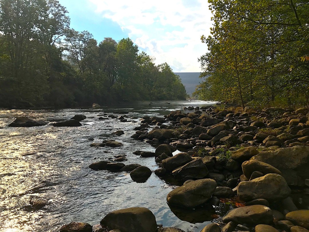 “I used a barbless hook,” he said. “They got one in here, a rainbow, must be 20 pounds. Not makin’ this up. I’m not braggin’ cuz I fish here all the time. You go up there and park ’cross from the garage — guy that owns it don’t care, he don’t live there — and you cross a little wooden footbridge, where there’s a picnic table, right? You can get in [the river] there. I use my kayak. I put in there. The wadin’ here is tough; my knees aren’t good. There’s a nice pool there. And you been to the pool behind the Have-A-Lot store? You know where that is? They got some big ones in there. You get one on . . .”