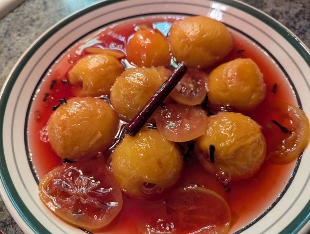 With peaches bountiful in late summer, we tried this recipe for Poached Peaches on Sweet Cream from the 25th anniversary edition of John Shields’ popular Chesapeake cookbook. You can find it on page 298. The poaching calls for spiced white wine, with a caution not to overcook the peaches — they should be tender but still firm to the fork. The result was great. We served ours with a little vanilla ice cream.