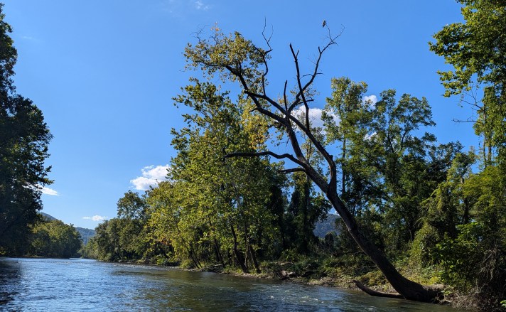 It’s speculation on my part, but I suspect that the osprey perched high in a tree above the river was hoping for an assist from the two anglers down below. The bird was no freeloader, just an opportunist looking for an easy meal.