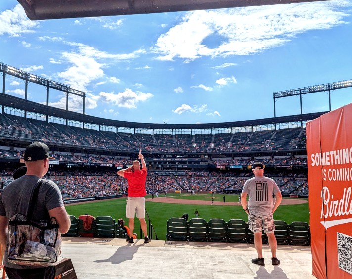 Sept. 11, 2025: Baltimore Orioles v Pittsburgh Pirates: At Camden Yards on warm and sunny Thursday afternoon, the Orioles scored a go-ahead run shortly after fans had taken their 7th-inning stretch. Dylan Beavers’ clutch single brought Jackson Holliday home from second, putting the Orioles in the lead, 3-2. These photos, taken from a plaza above the centerfield bleachers (Section 96), catch a man-fan in celebration — one hand on his cellphone, the other on a beer. The man was on the phone as the inning began, and the conversation continued after the Orioles scored. The home lead held, the game ending in an unusual way — a Pittsburgh player caught trying to steal second with two outs in the top of the 9th.