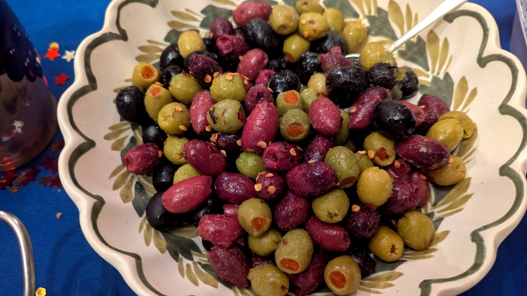 I put out a mixture of green, black and kalamata olives, tossed in extra virgin olive oil and sprinkled with red pepper flakes. I also served a plate of fresh mozzarella slices with an extra virgin drizzle. Crusty bread for everyone, too.