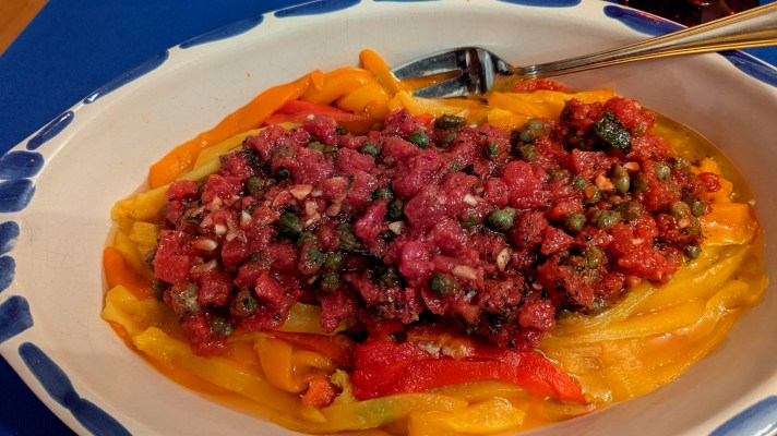 Bugialli’s pepper salad: Roasted red and yellow bell peppers, the skins removed and sliced into strands, topped with a tapenade of chopped tomatoes, capers, parsley, mint and garlic. I use olive oil in all of these preparations.