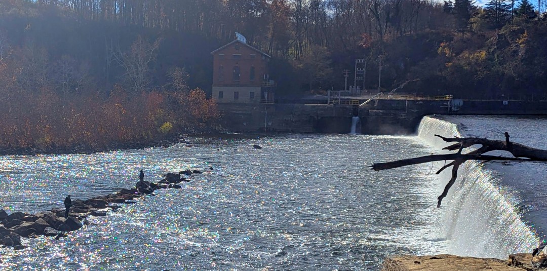 As I approached to get a closer look, I saw what appeared to be fishing lines looping into the air below the dam. At the end of the lines were fishing lures of some kind, but the wind was so strong, blowing directly downstream, that the lures curled back toward the two anglers who cast them. I assumed they were inexperienced in fishing in strong winds, or perhaps I had witnessed their first casts, before adjustments for weather. If there ever was a day for low, side-arm casting into a plunge pool, it was this one.