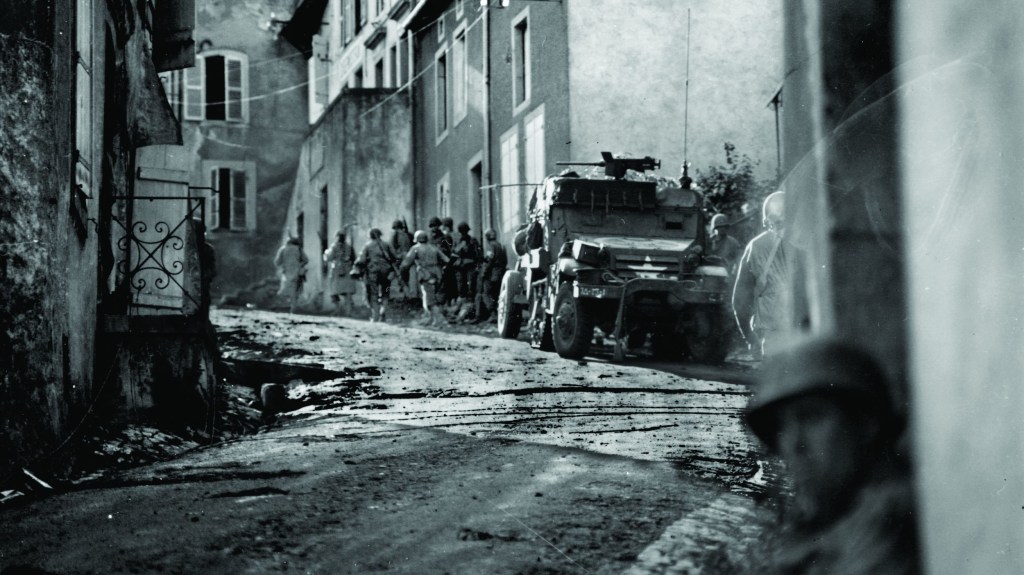 When I was out there yesterday, I saw only one Christmas tree. Some soldiers posted along a road had set it up on top of their cannon which was aimed toward Germany. They had no Christmas bells and no tinsel with which to decorate it, but I think it was the bravest Christmas tree I have ever seen. Until a few days ago it didn’t seem at all like Christmas. Even in the bigger towns of Lorraine, like Metz and Nancy, there were no holly wreaths, no red ribbons, no bright shop windows. Somebody told us they saw one Christmas tree in the window of one store in Nancy, but we never saw it. Big balls of mistletoe grow wild in the tree tops of Lorraine, but nobody seemed to take the slightest interest in it.
