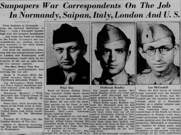 Lee McCardell was the most famous war correspondent of the Baltimore Sun. The first Sunpapers writer to get into the action after the bombing of Pearl Harbor in 1941, he reported on the fighting in Italy and covered D-Day. He was believed to be the first American correspondent to reach liberated Paris and was among the first to write about Nazi death camps. But Baltimore readers got to know a personal side of him as well from the letters he sent home to his three young daughters, Mary Ann, Abby and Tillie, every Christmas. The Sun ran the letter on the front page. In December 1944, while with the U.S. 3rd Army during the Battle of the Bulge, this is what McCardell wrote: