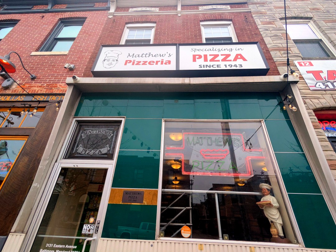 It turns out that Matthew’s Pizza, Baltimore’s oldest and most famous pizza shop, has been serving a pizza pie distinctive to the region of Massachusetts where I grew up — a fact that occurred to me only recently.