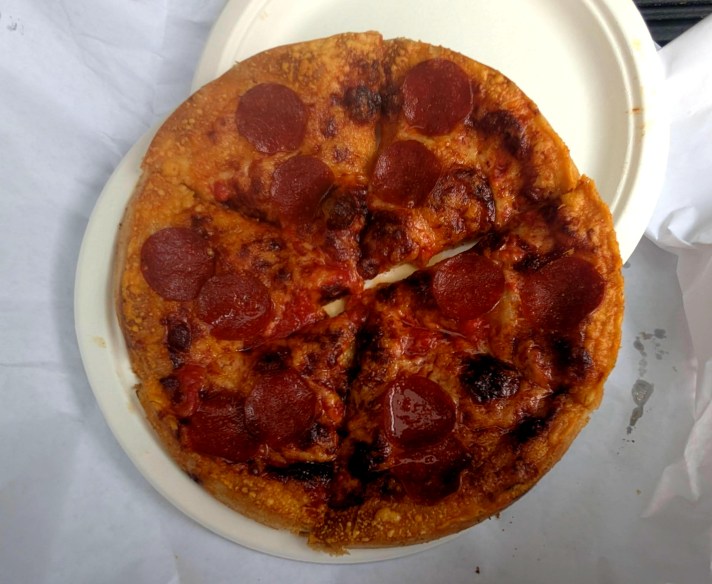 This is pretty much what happens with Matthew’s pizza pies in Baltimore. They sell a traditional tomato pie without cheese; a pie with grated reggianito (the Argentine version of Parmigiano Reggiano) or one with mozzarella. Served on cardboard, wrapped in paper to go.